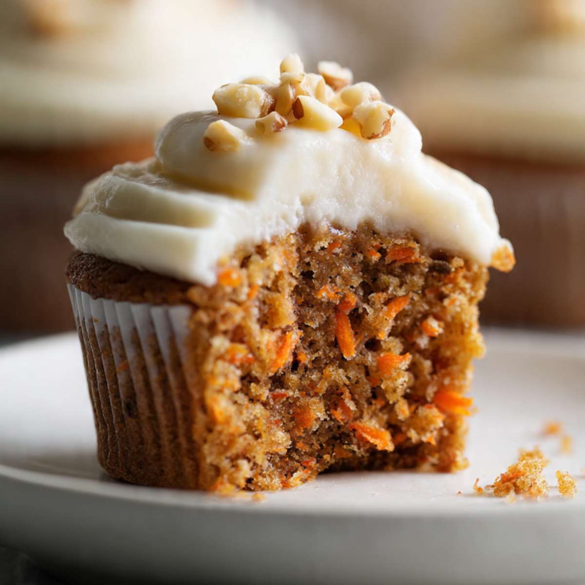 Grated carrots hold moisture as the cupcakes bake, which keeps the crumb soft. Oil helps the cupcakes stay tender even after cooling. The thick cream cheese frosting balances the sweet cake and adds a smooth, rich layer on top. Baking them as cupcakes keeps the size even and helps them bake through without drying out.