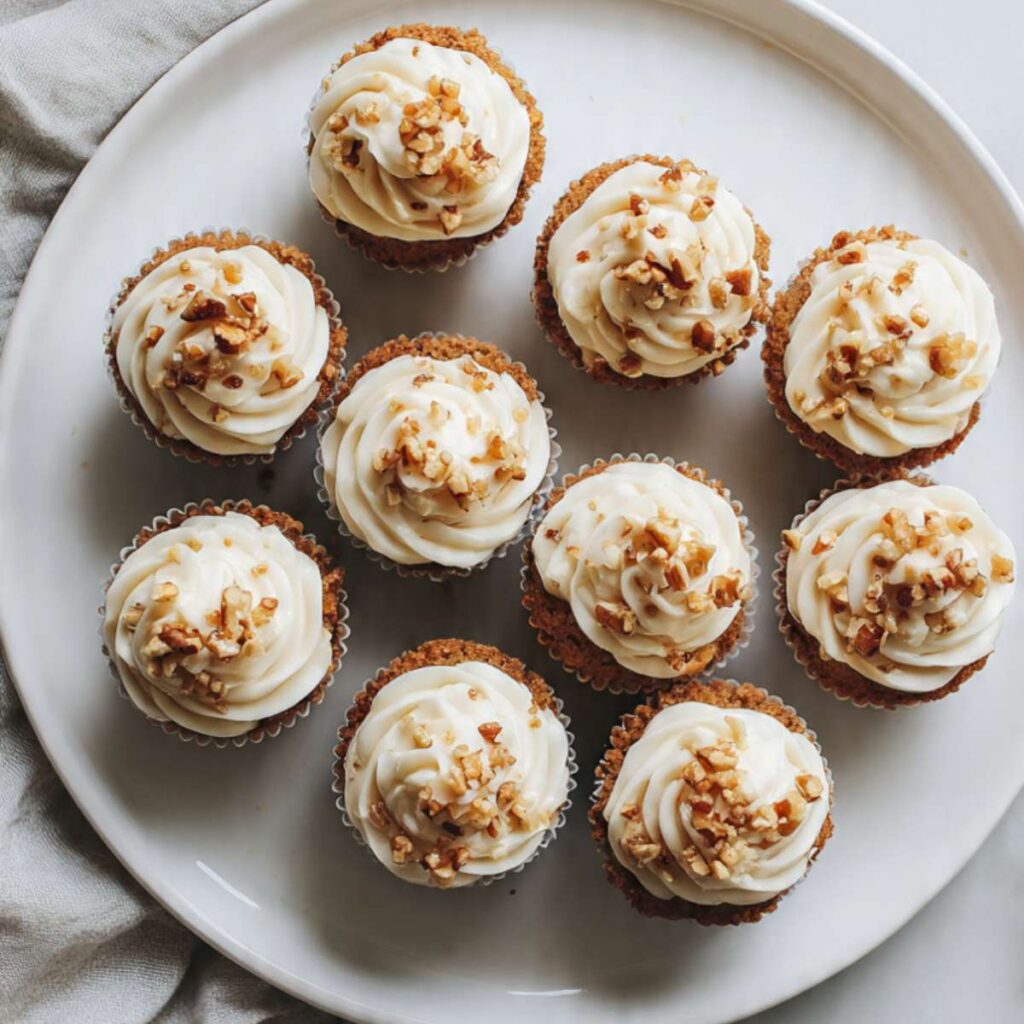 Once the cupcakes are fully cool, I spread or pipe the frosting on top. I finish them with chopped nuts or small carrot decorations if I have them. The frosting should sit neatly on top without melting or sliding.