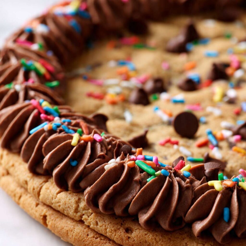 A cookie cake is baked like a cake but mixed like cookie dough, which is why it stays chewy instead of fluffy.