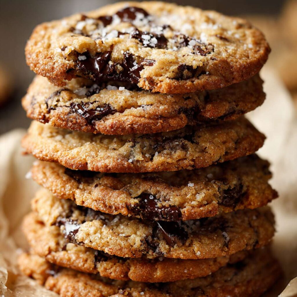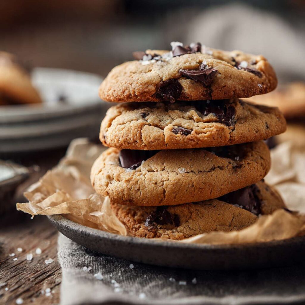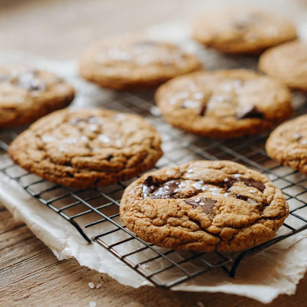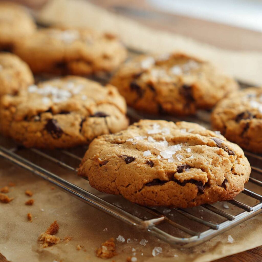 I bake the cookies for about 12 minutes. When they are done, the edges look lightly golden, but the centers still appear soft. If I want a salty finish, I sprinkle flaky salt on top right away. I let the cookies rest on the baking sheet for about 10 minutes before moving them to a cooling rack to finish setting.