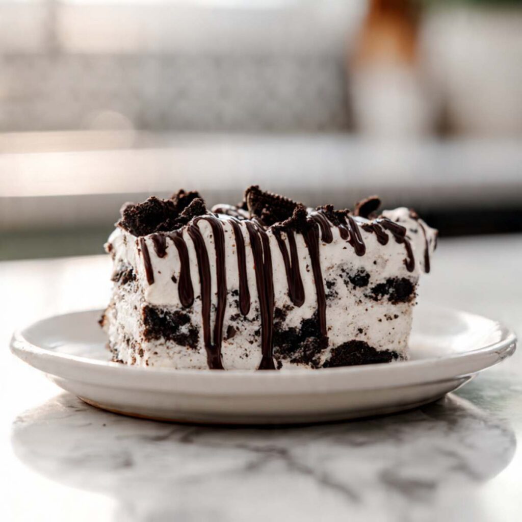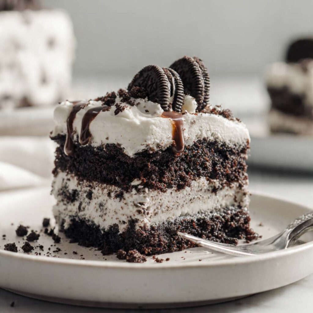 Poking holes lets the cream soak deep into the cake, which keeps it very moist. The soft chocolate cake balances the sweet cream filling. Oreo crumbs add texture, so every bite has soft cake and crunchy topping.