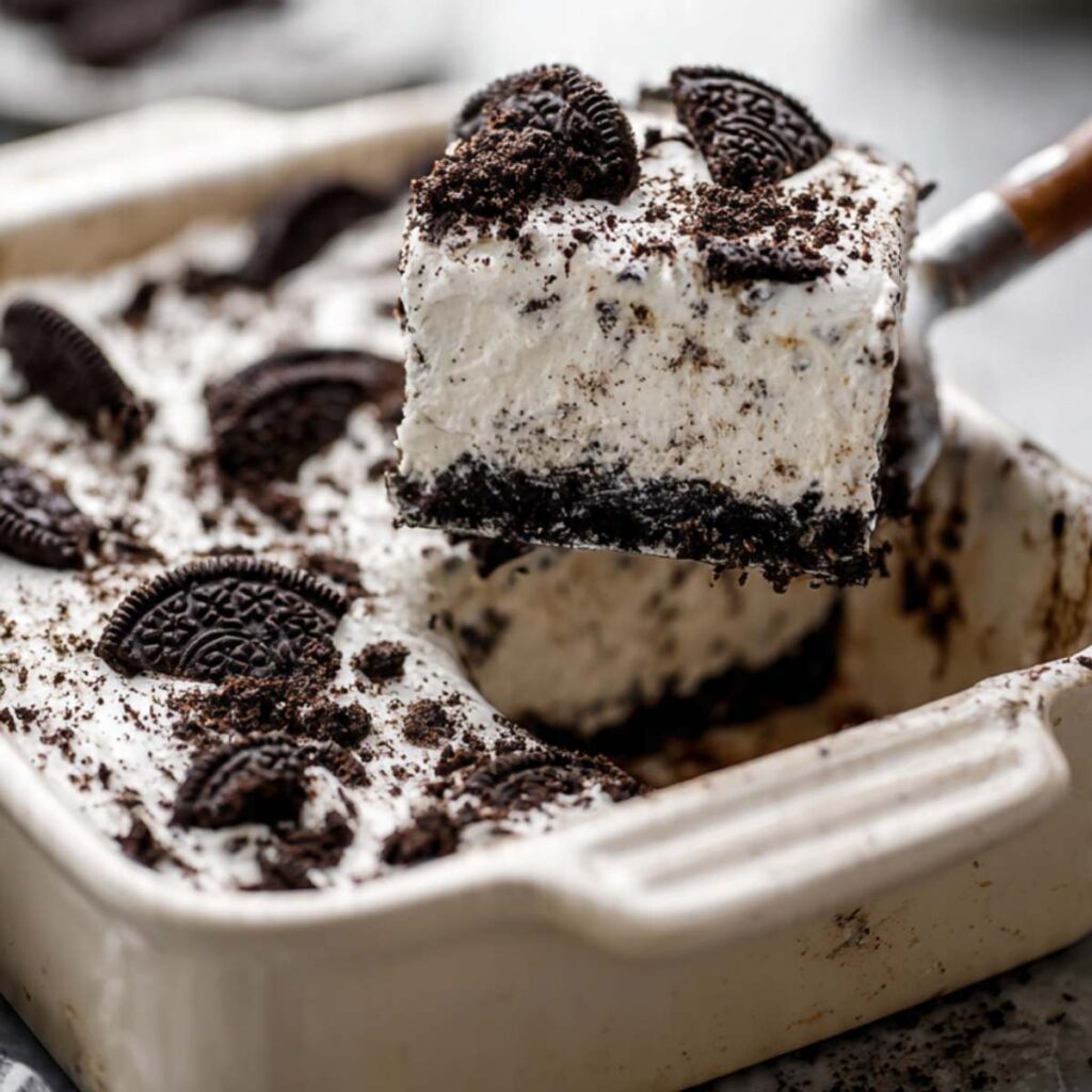 I usually cut this into big squares and serve it cold. It goes well with a glass of milk or plain coffee. I keep extra Oreo crumbs nearby in case anyone wants more on top.
