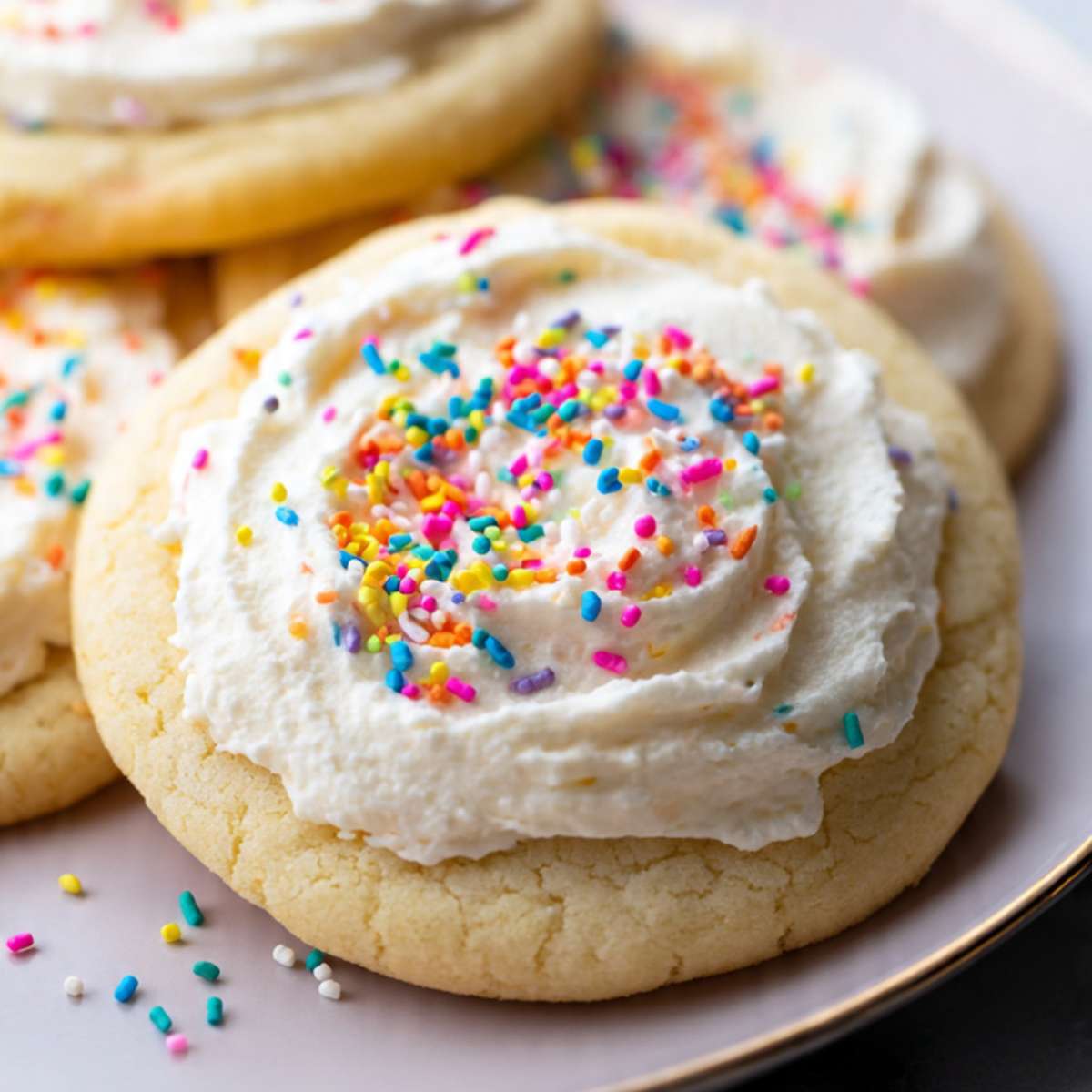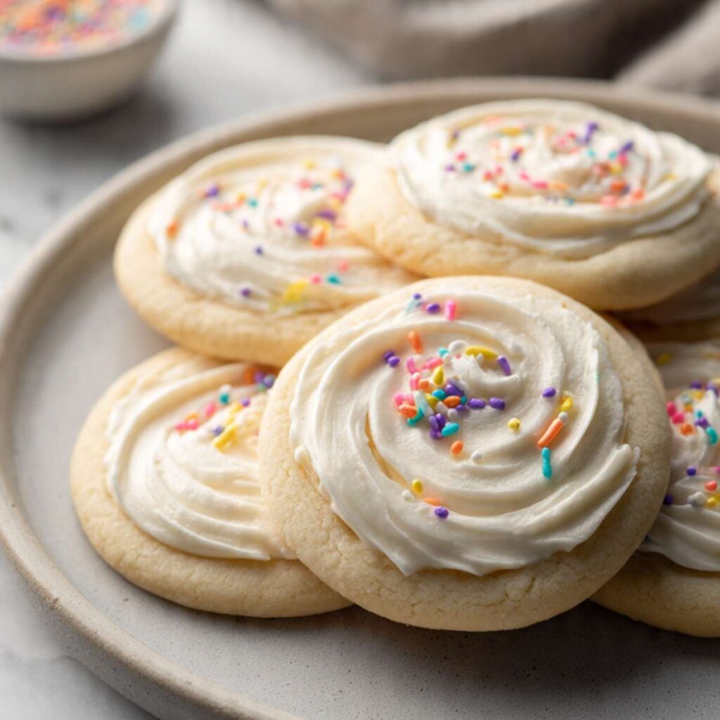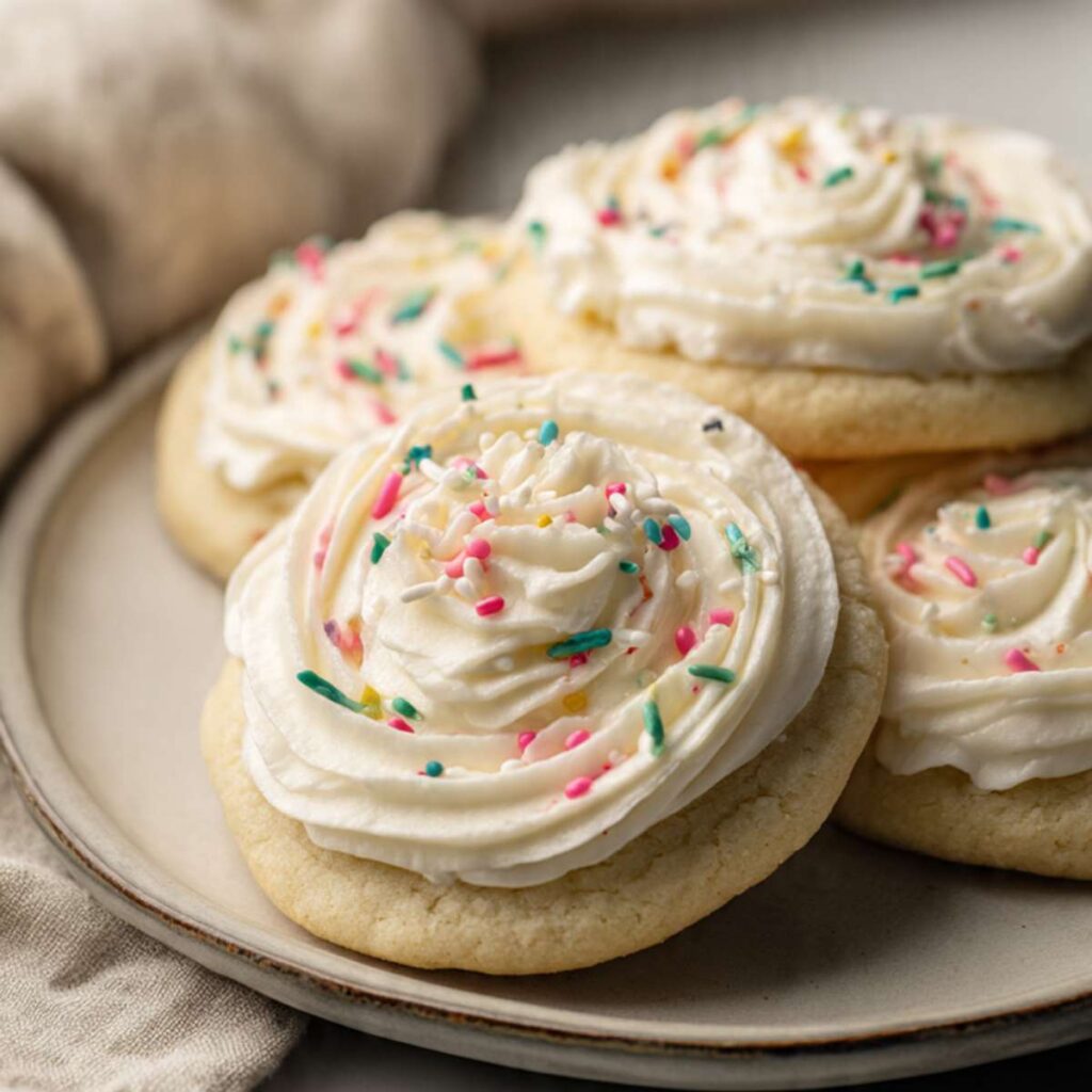 The dough is mixed just enough to keep the cookies soft. Baking them until pale keeps moisture inside. The buttercream frosting adds sweetness and a creamy feel that balances the mild cookie.